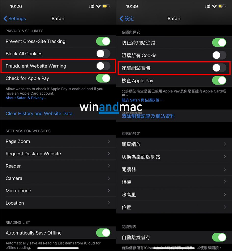 目前唯一解決方法,是進入系統設定把其關閉。方法是按系統設定,選擇Safari,向下撥,找到如下圖把Fraudulent Website Warning詐騙網站警告關閉: